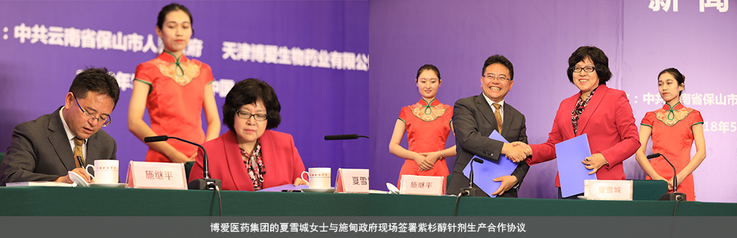 會議最后,博愛醫(yī)藥董事長夏雪城女士與施甸政府在現(xiàn)場簽訂了紫杉醇針劑生產(chǎn)的合作協(xié)議,正式締結(jié)伙伴關(guān)系,這意味著目前我國最大的紫杉醇及紫杉醇注射液生產(chǎn)、研發(fā)基地將啟動建設(shè)并落戶云南施甸,該項目全面投產(chǎn)后,中國將擁有紫杉醇的世界定價權(quán)。